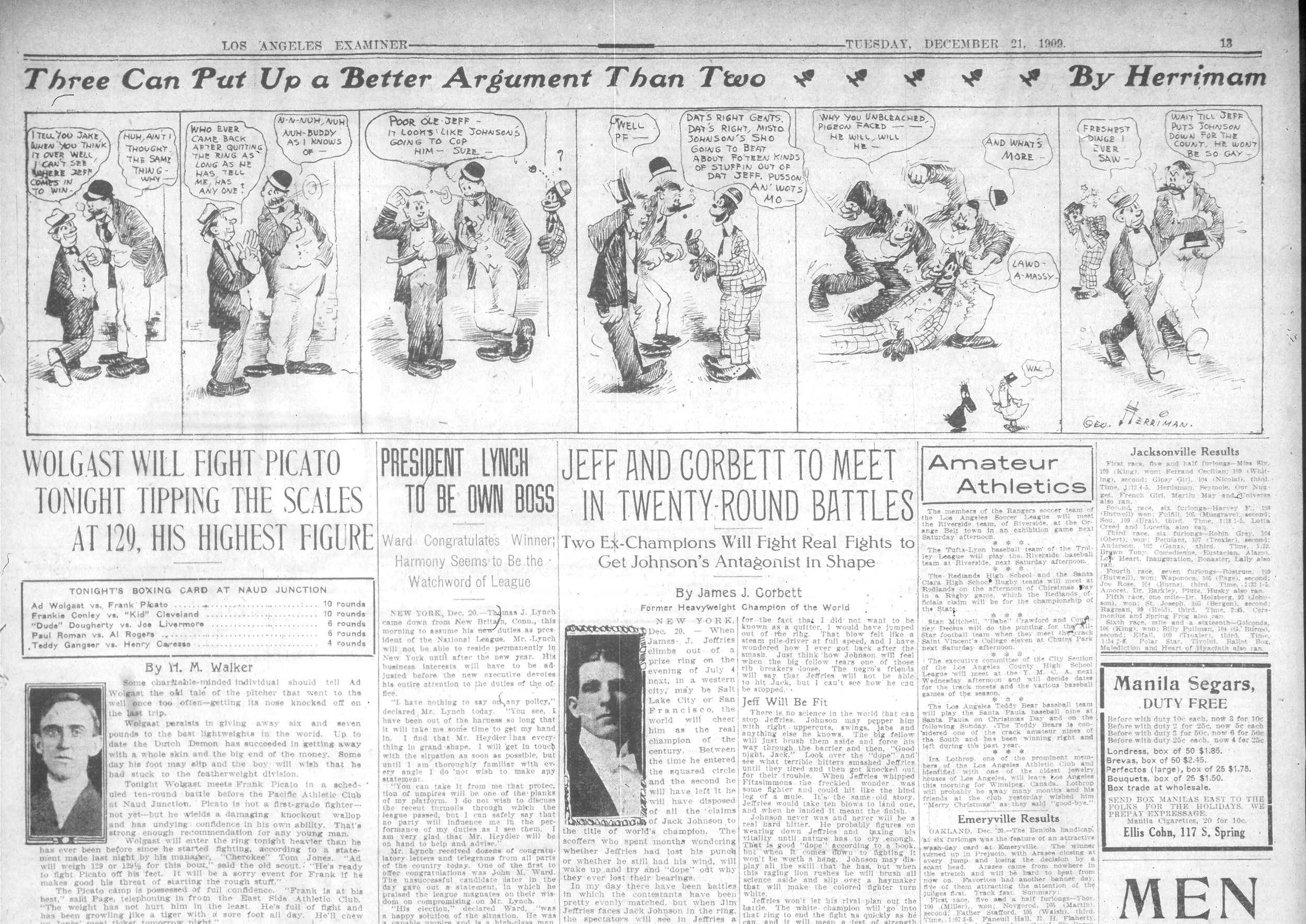 Herriman was never more direct about race and racism than in the months leading up to the boxing match between champion Jack Johnson and challenger Jim Jeffries. Using common blackface images not unlike other cartoons seen in newspapers of the day, he tells a very different story about a “Lily White” crown and those seeking to “discolor” it. When Johnson finally defeats Jeffries, Herriman celebrates by updating Uncle Tom’s Cabin. In a cartoon about Black boxer Sam Langford, Herriman introduces the figure of a cat who would soon become Krazy Kat, which debuted shortly after the Johnson-Jeffries bout. Also included is a cartoon by Tad Dorgan that centers on a large, unusually realistic drawing of Johnson that respectfully places him in the lineage of past champions. Herriman and Dorgan were exceptions, for such respectful treatment was unusual for cartoonists of the day. For more on these images, see the introduction to The Illustrated Krazy.